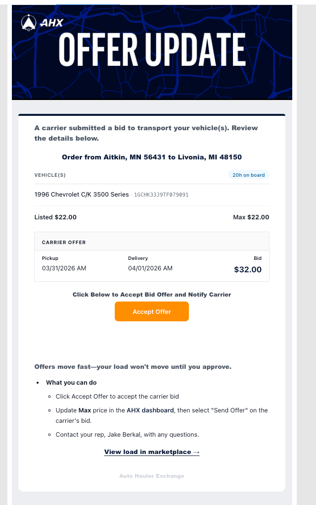 If a carrier submits a bid that exceeds your max price, you will receive an email allowing you to review and accept the offer if you choose.