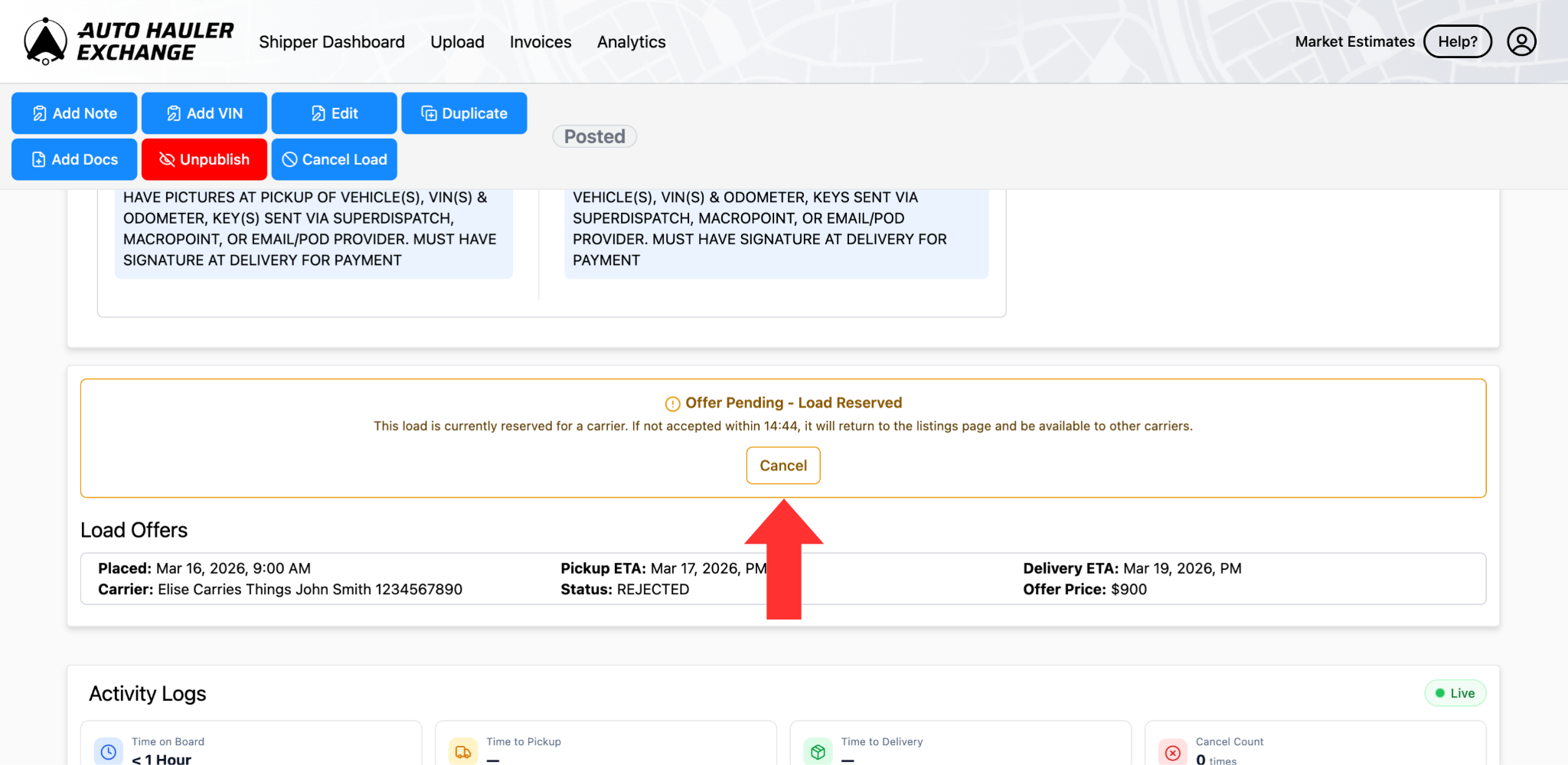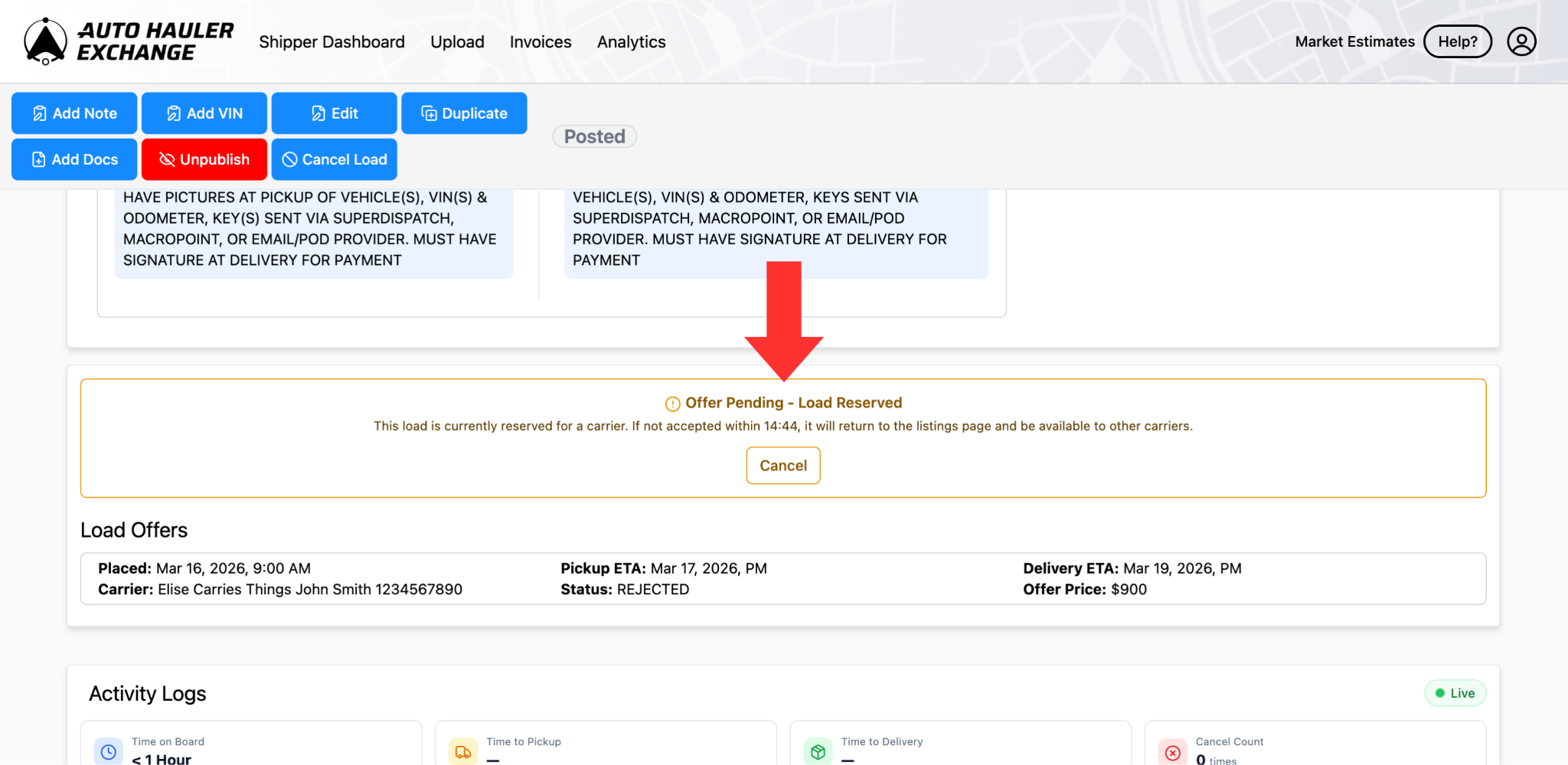 The carrier will then have 15 minutes to accept or reject the offer. You will see an “Offer Pending - Load Reserved” status while this time elapses.