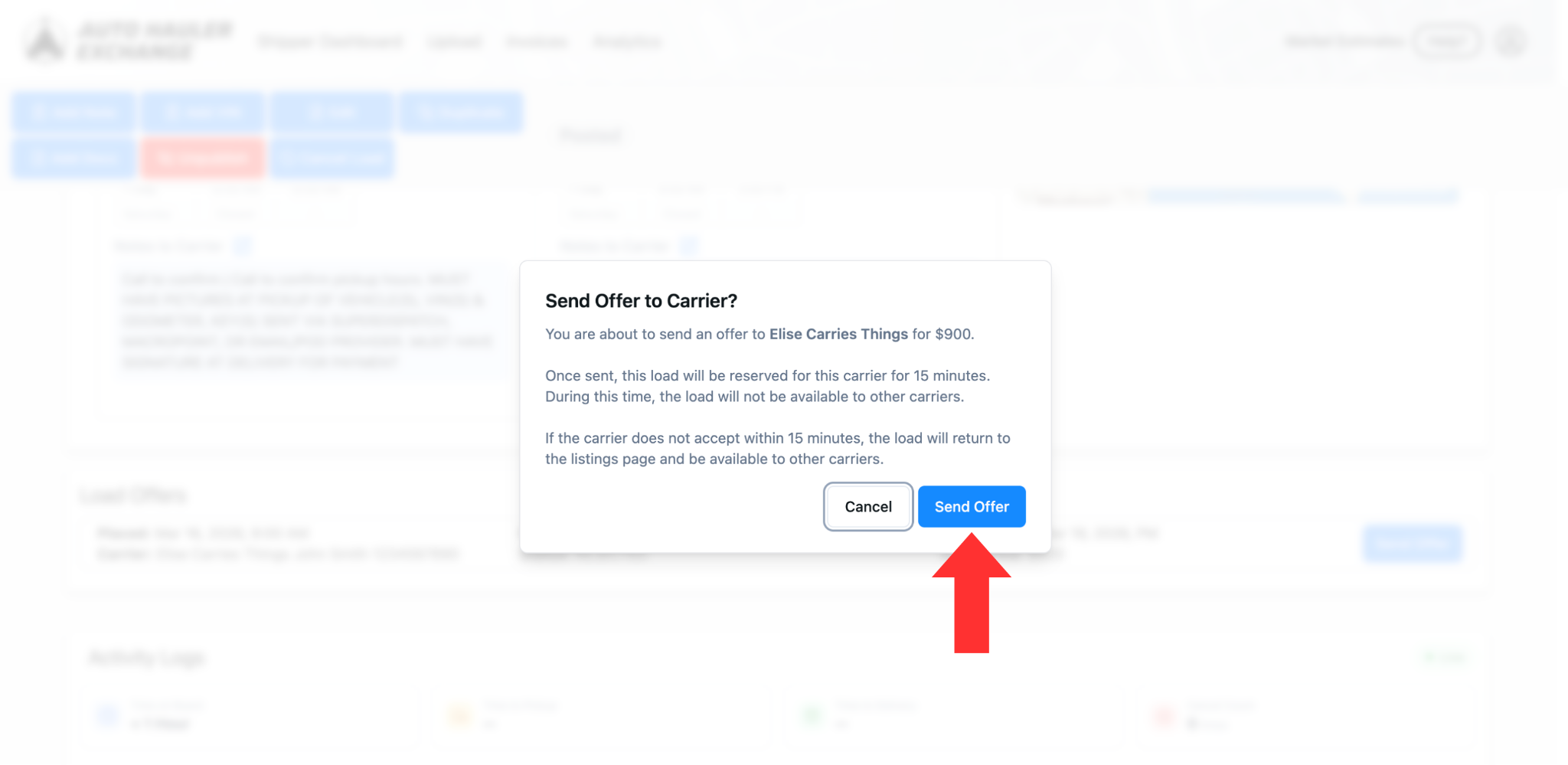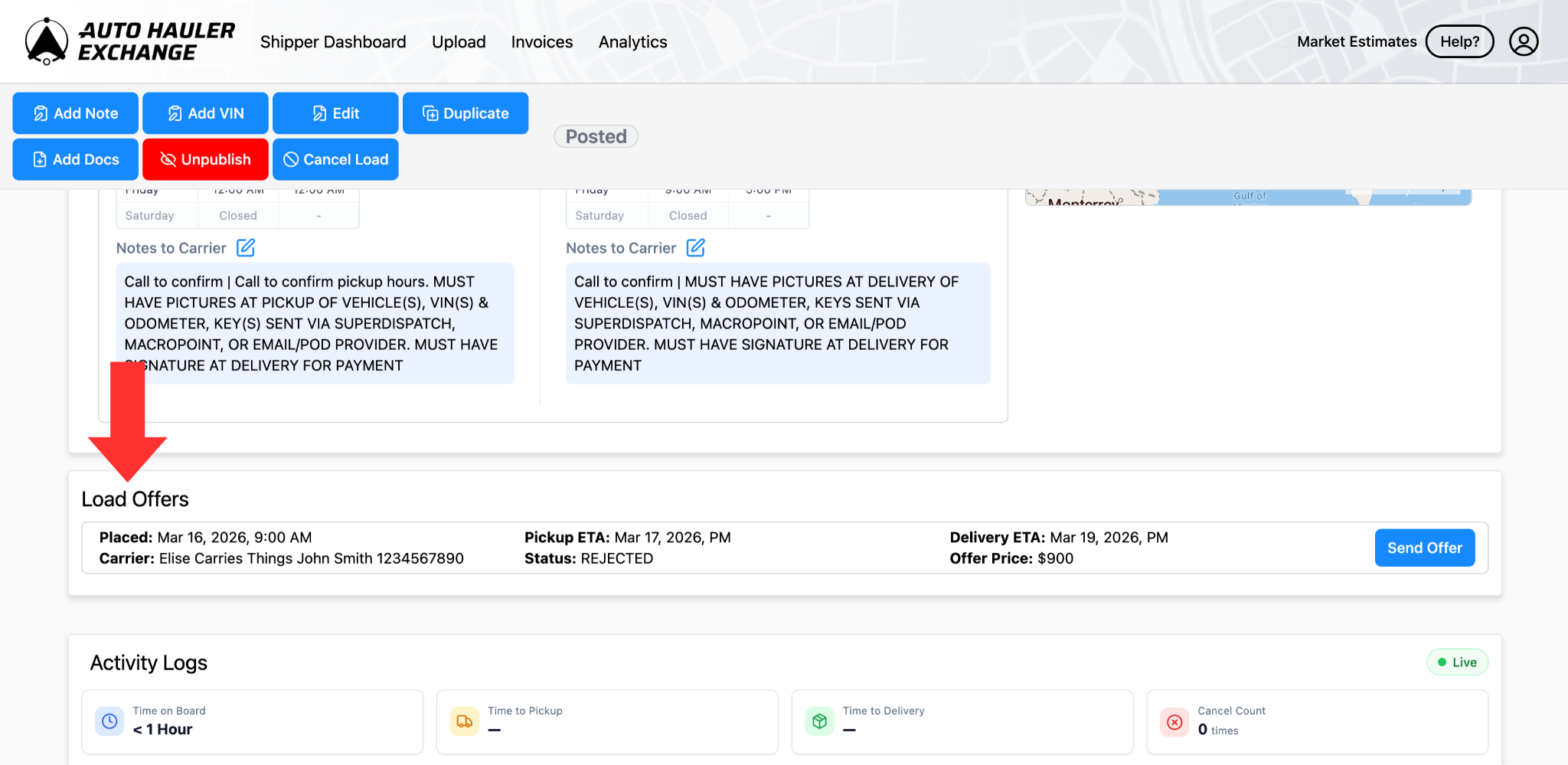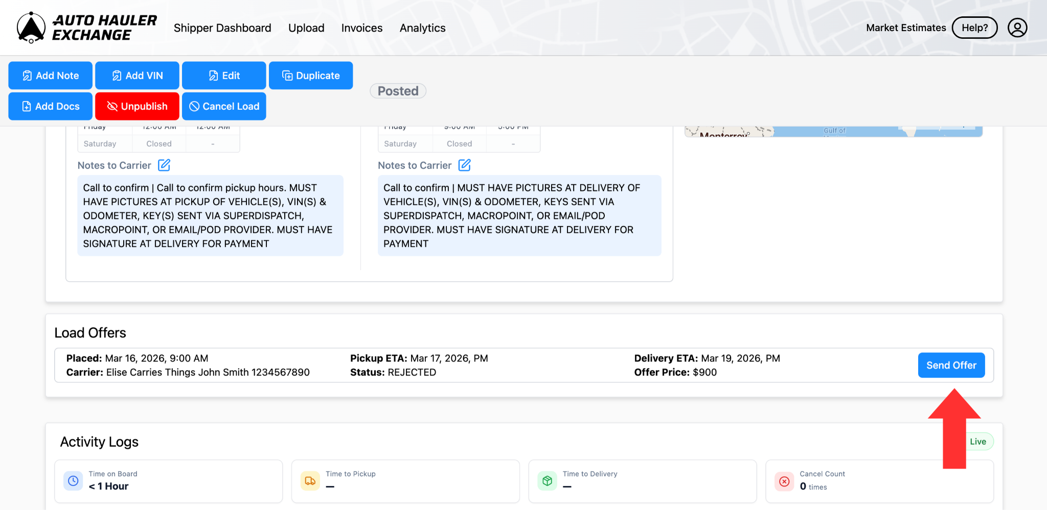 If you want to offer this price back to the carrier, you can click “Send Offer.”