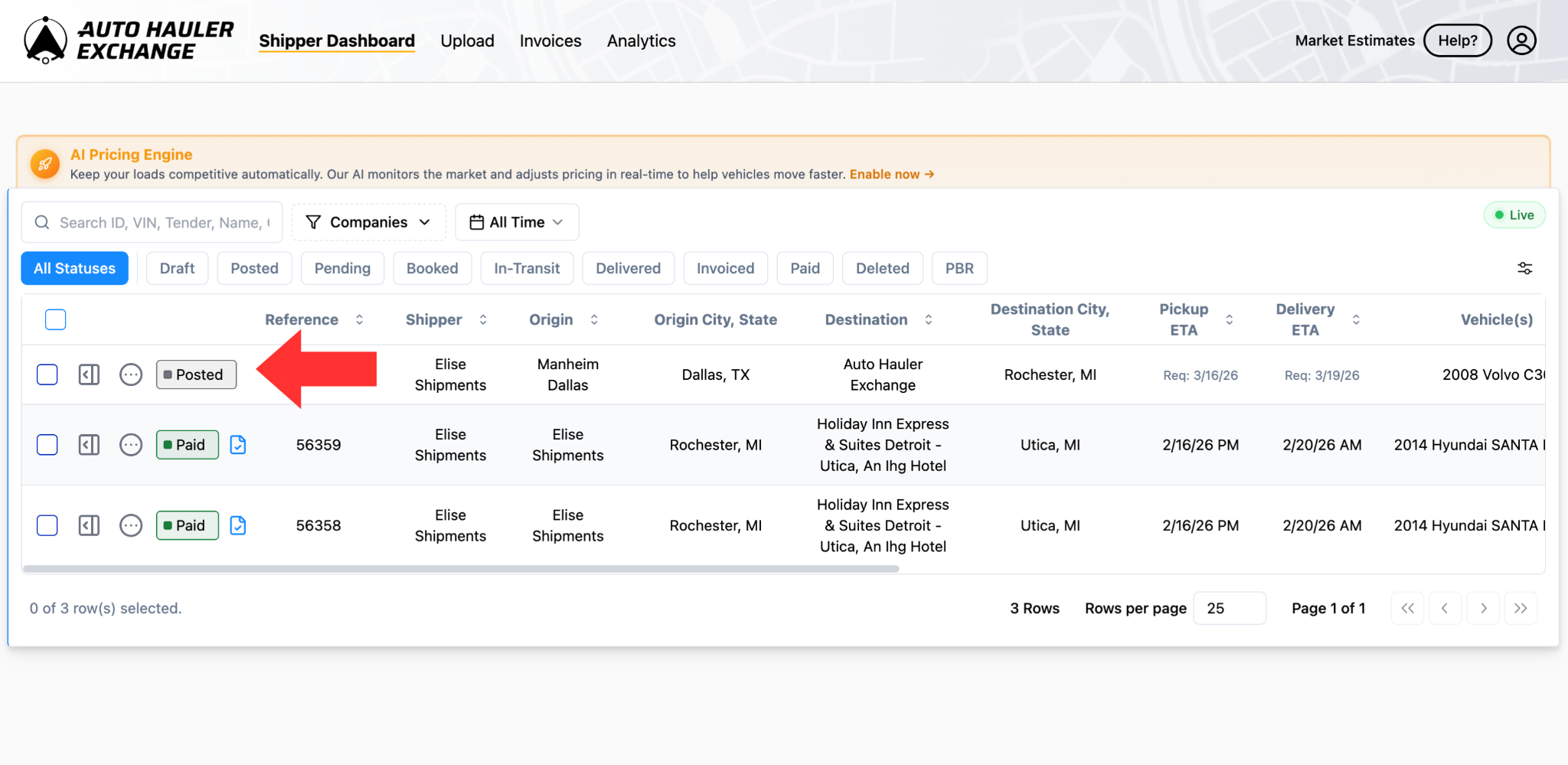To find the bids placed on your load within the platform, select the load in which the bid was placed on.