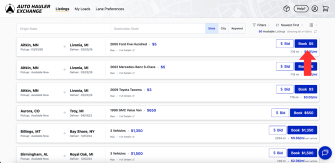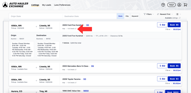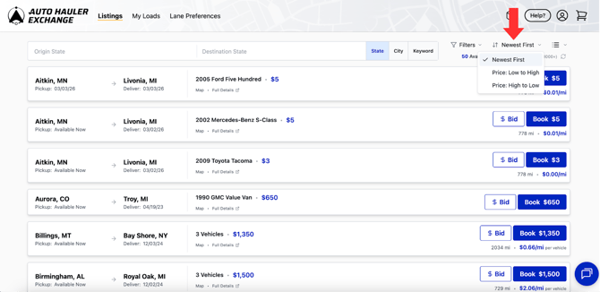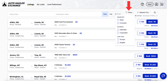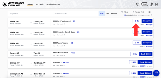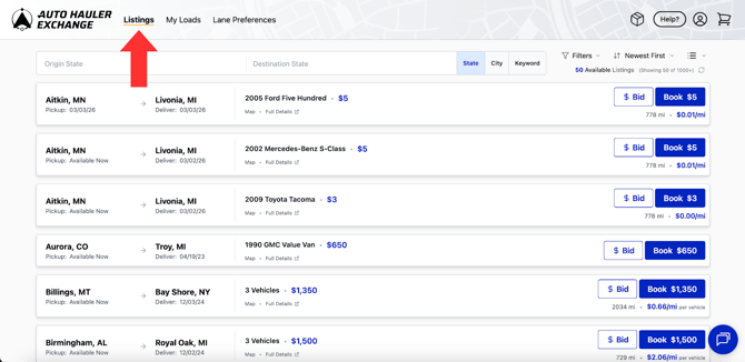 You can search for listings by entering an origin or destination city or state, or by using a relevant keyword to quickly narrow your results.